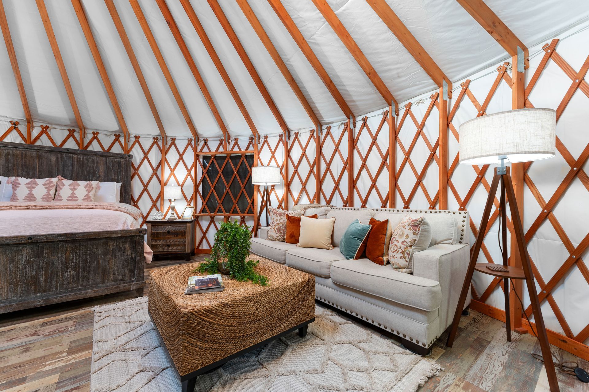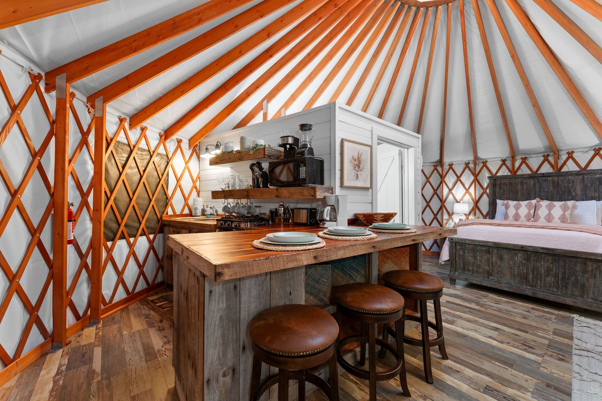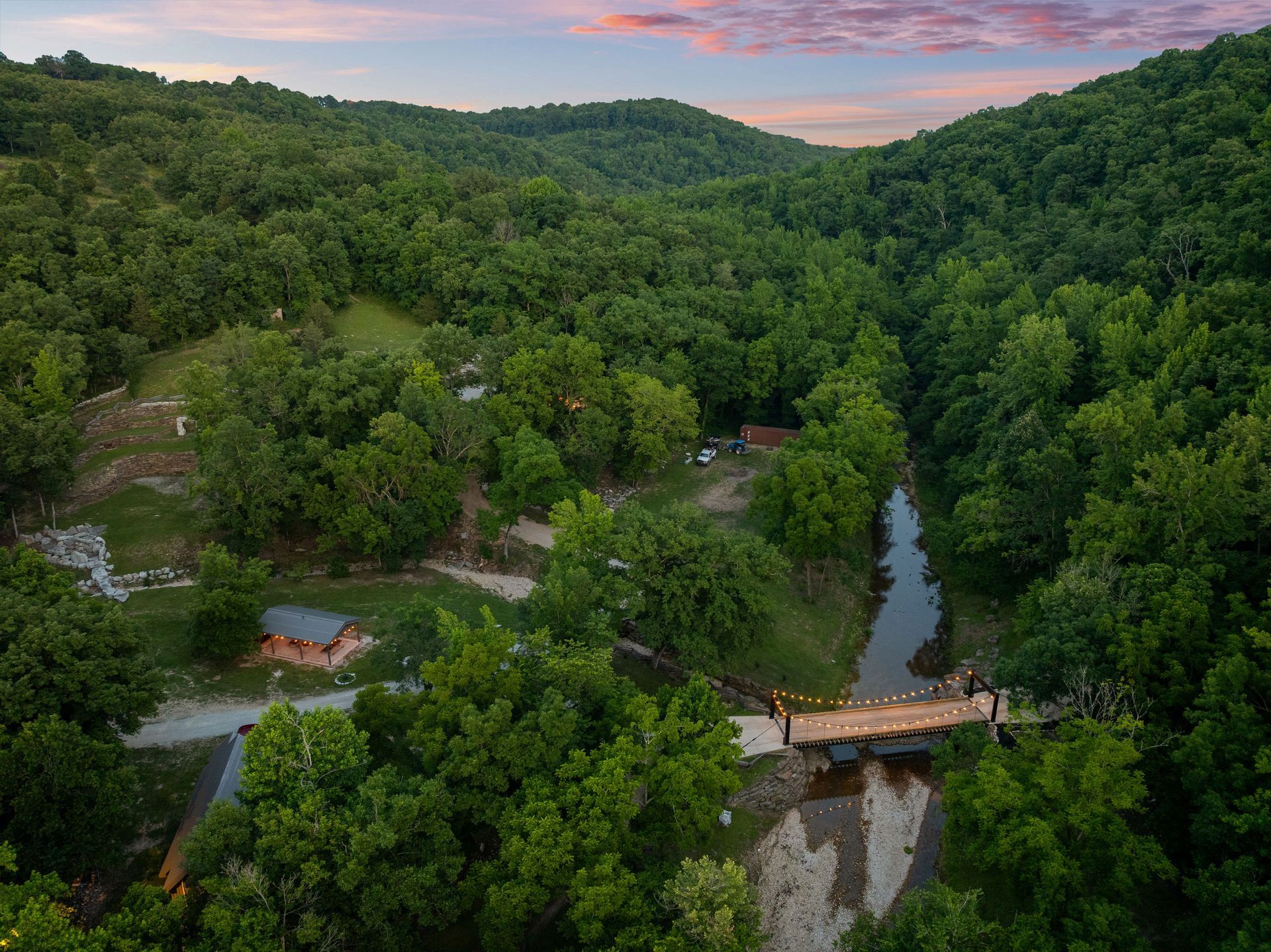 The Sky View Yurt is one of the unique Creek Cabins at Brush Creek. The yurt is such a beautiful unique way to experience the Buffalo River area. This yurt is equipped with everything you need to be comfortable and cozy. Perched fourteen feet off the ground, the yurt deck offers a beautiful view of the grounds below and Brush Creek. The round shape allows you full view of the entire inside area. Stepping into the Yurt you immediately notice a large sky light above perfect for letting in natural light and star gazing. The yurt sits on a large deck platform which allows you room to walk around the entire structure. What a nice way to spend an evening under the stars. As you walk inside the yurt you are welcomed by a nice living room with a full size sofa bed and a queen size sleeping area. An Island bar borders the kitchen. Behind the bar is a kitchen with a small two burner stove, sink, and a refrigerator. The kitchen is stocked with dishware and plenty of utensils to cook a nice meal. Off of the living area is a nice size bathroom complete with a full size shower. Outside you can enjoy a large wrap around deck, and grill area. A unique fire pit and boulder hot tub create an amazing experience. Swim in the creek bordering the property or just relax on the creek bank. This place has it all.